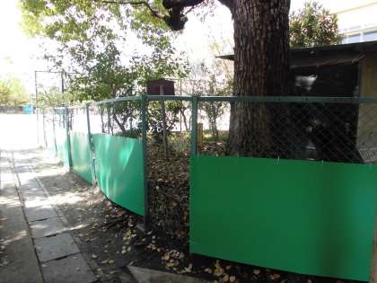 管理用務員さんが,落ち葉が広がらないように,果樹園のフェンスについたてを付けてくださいました。