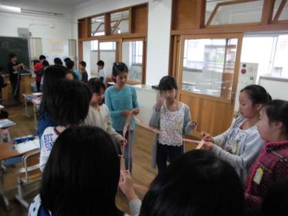 みんなで力を合わせてひもを引っ張ると,綺麗な立方体が出来ました。