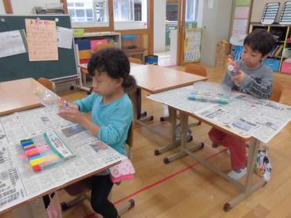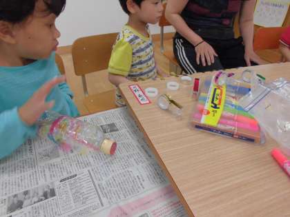 ペットボトルに色を塗って,キラキラテープで飾ります。