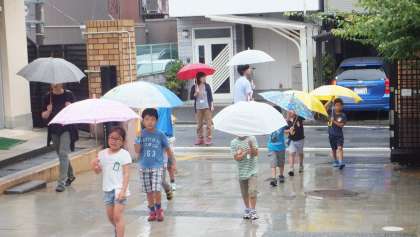 1・2年生は,雨の中,実際に学校の周りの道路を安全に気を付けて歩く練習をしました。中京警察署の方や地域・PTAの方に見守っていただき,傘の差し方にも気を付けながら白線内をしっかりと歩くことができました。
