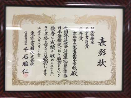 本校で6月に実施した「平成28年度第1回日本語検定」で,朱雀第四小学校が『東京書籍優秀賞』を受賞しました。まさに子どもたちのがんばりによるものです。