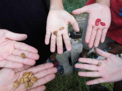 赤くてやわらかいものを取ると,中から茶色くて固い種が出てきました。