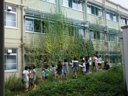 グリーンカーテンがぐんぐん成長して,実も大きくなりました。