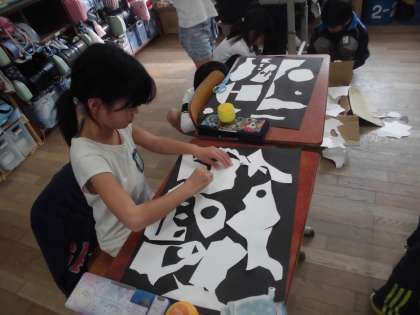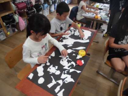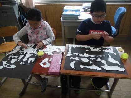 図工「はさみのアート」で,表現活動を楽しみました。白い画用紙を自由に切り,できた切れ端からどんなものに見えるか発想し,黒い画用紙に構図を考えながら貼りました。「ペンギンみたい!」「スプーンにも見えるよ!」など,一人一人違った視点で白い画用紙を自由に貼り表現していました。どの作品も,個性豊かでおもしろい作品になりました。