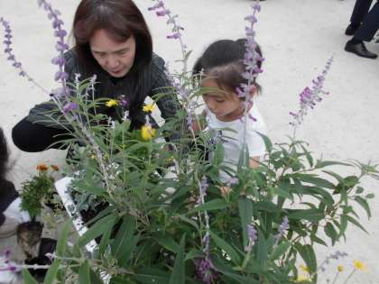 あかしやの森の前で,京都市緑化協会の駒井先生に自然の重要性やプランターへの植え付け方を教えてもらいました。配置図をもとに子どもと大人が力を合わせて,花の苗を植え付けました。