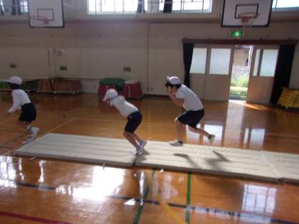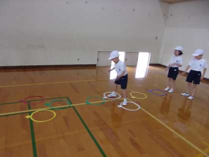 コーンやマットなど色々な場で、友達の動きの真似をしながら進んでいきます。跳んだりまわったり、様々な動きを楽しんでいました。