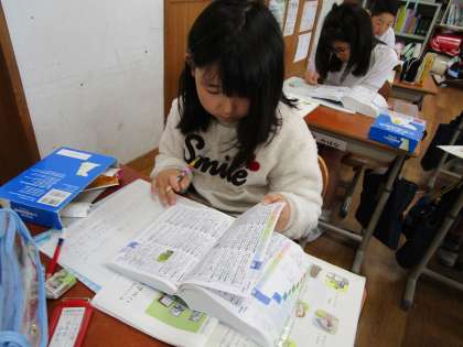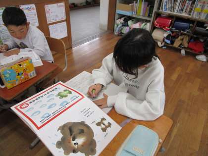 ことわざのいろはかるたを楽しんだ後は、それがどんな意味か本を使って調べました。