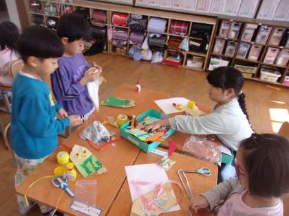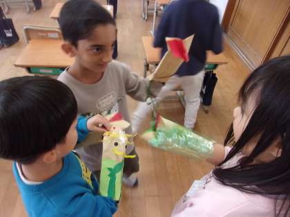 封筒を使ってパペットを作りました。実際に動かしながら、ボタンや紙テープ、画用紙などで飾り付け、自分だけのパペットができました。