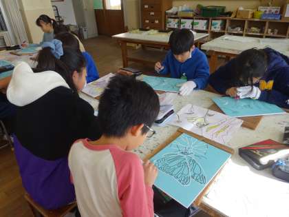 彫刻刀を使って彫り始めました。最初は、白くしたいところを彫っていきます。安全に気を付けながら彫刻刀を使っていました。