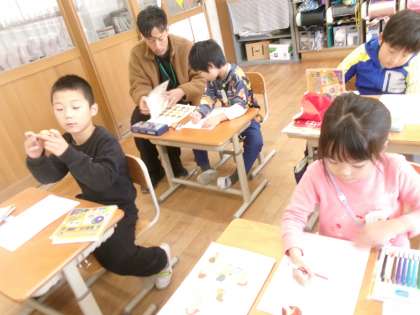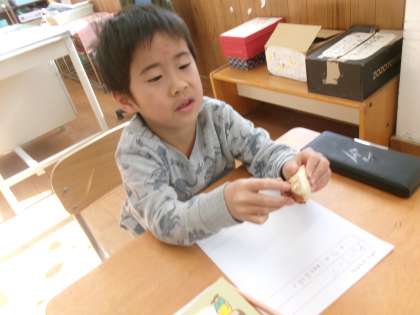 チューリップの球根を観察しました。「へ〜、チューリップは種じゃないんだ。」「思ったより大きいね。」と、実際に球根を手に乗せ、色や形などを観察していました。来週に、その球根を植える予定です。何色の花が咲くのか、今から楽しみのようです。