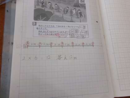 そこで実際に図をかいて考えました。はじめはどう考えれば戸惑う子もいましたが、友だちと話をする中で、間の数は木の本数より少ないことに気がついていました。