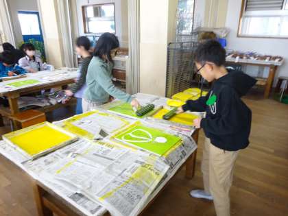 白で表したい部分を彫ったら、黄色のインクで刷りました。インクの濃さや、こすり方などのコツを見つけながら刷っていました。