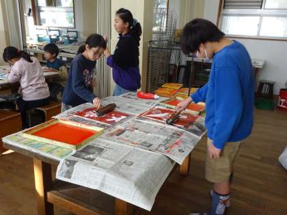 黄色で刷ったら、次は赤のインクで刷っていきました。2色重ねると、きれいになってきています。