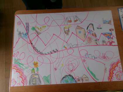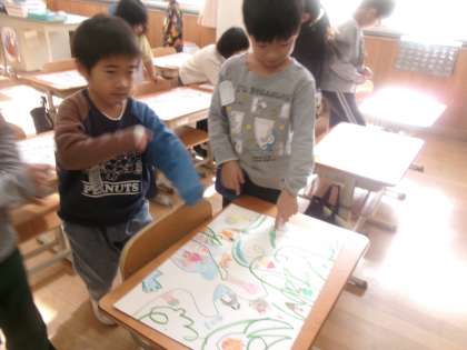 くねくね道、ギザギザ道、クルクル道。いろんな線で描いた道を通ると、どんな冒険ができるかを想像して描きました。ペンギンさんが餅つきをしていたり、サンタクロースが道に迷っていたりと、いろいろな冒険が描かれていました。