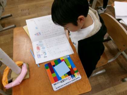 国語科の学習では、生活科の学習で作った、おもちゃの説明書を作っています。