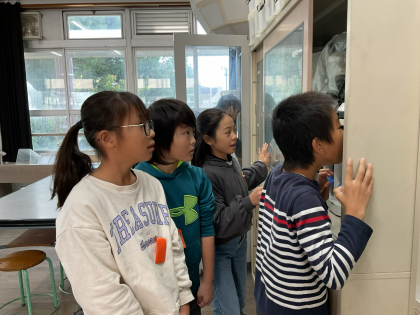 子どもたちが初めて理科室に入りました。普段の教室とは違う雰囲気に、みんな目を輝かせていました。並んだ実験器具や標本を見て、「これでどんなことができるんだろう?」と興味津々。