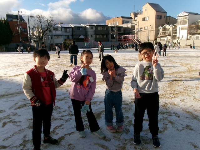 昨日から楽しみにしていた雪がうっすらと積もりました。朝の準備が終わると、早速、雪を触りに運動場に向かっていました。とっても冷たい雪を触って、嬉しそうな1年生でした。
