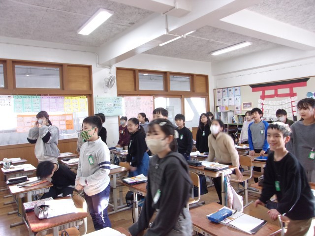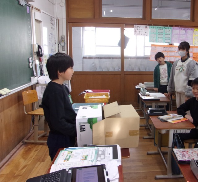 角柱や円柱の形をした積み木や箱を触りながら、友達に伝わるように説明しました。