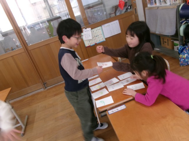 国語科の学習の様子です。ものの名まえには、まとめて付けた名前と一つ一つの名前があることを学習した後、お店屋さんごっこをしました。おかし屋では、「グミを一つ下さい。」「はい、グミをどうぞ。」というように、一つ一つの名前を確認しながら、お店屋さんごっこを楽しみました。