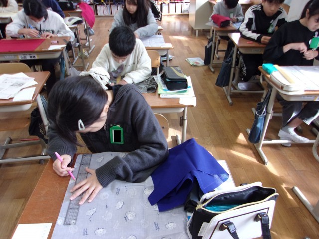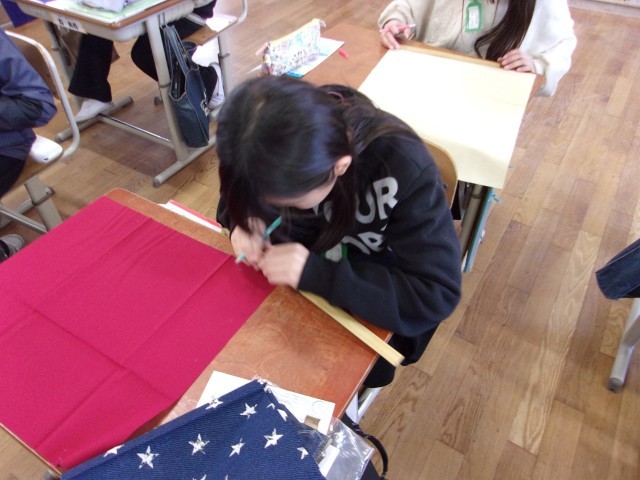 家庭科でランチョンマットづくりをしています。
