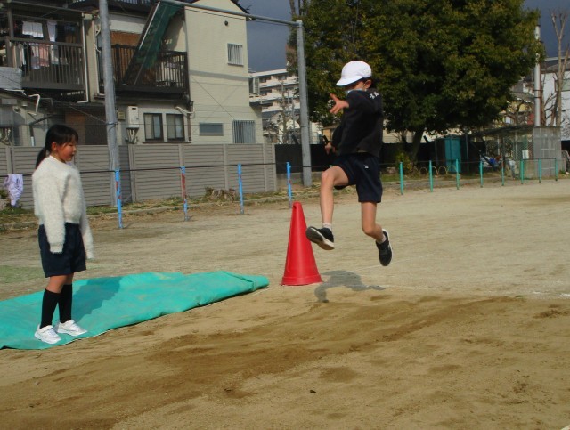 体育で幅跳びの学習が始まりました。初めての幅跳びで両足着地に苦戦しながらも、楽しそうに学習に取り組んでいます。