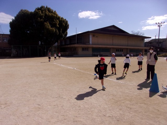 体育科「ゆっくりかけあし」で、ペース走をしています。
