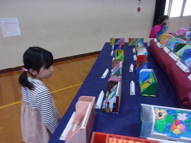 全学年の作品がずらりと並んでいる様子を見て「すごーい!」と喜んでいた1年生。