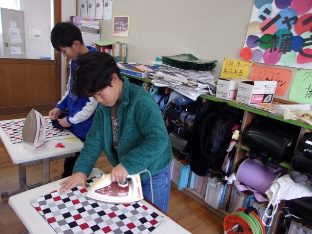 ランチョンの完成が近づいています。アイロンがけをして、ワッペンもつけました。