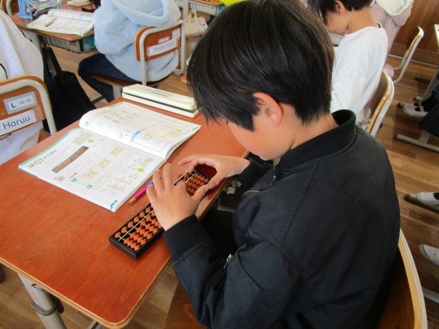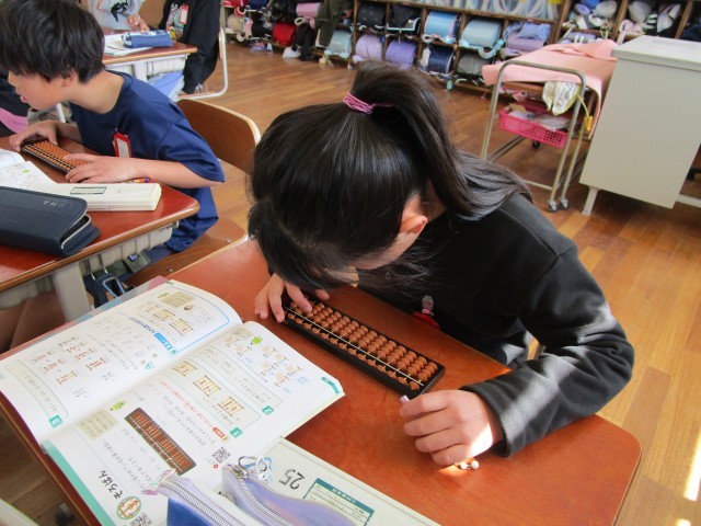 算数の学習でそろばんを使って計算しました。