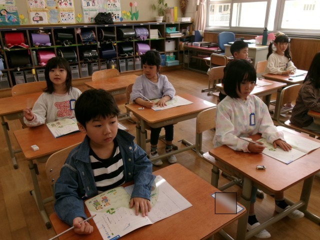 書写の学習が始まりました。まずは、鉛筆の持ち方を練習しました。そして、書く時の姿勢に気を付けて、たくさんの線をなぞりました。これらのことに気を付けて、これから、ひらがなの練習をしていきます。
