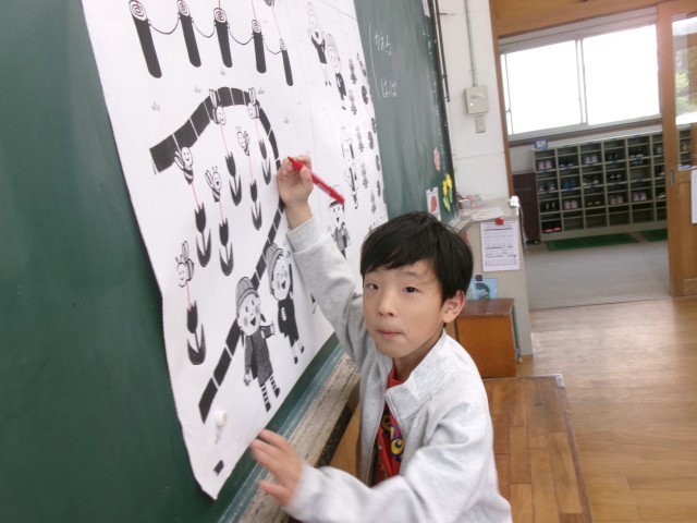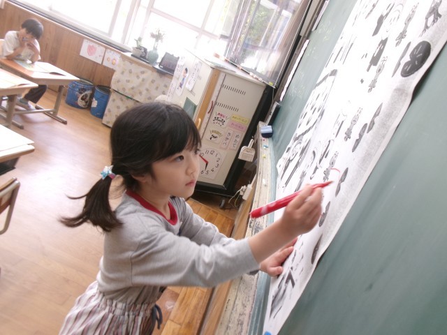 算数の学習が始まりました。今日は、二つのものの集まりを1対1にして、どちらの数が多いかを調べました。「線でつなげると、すぐわかるね。」と、楽しそうに学習をしていました。