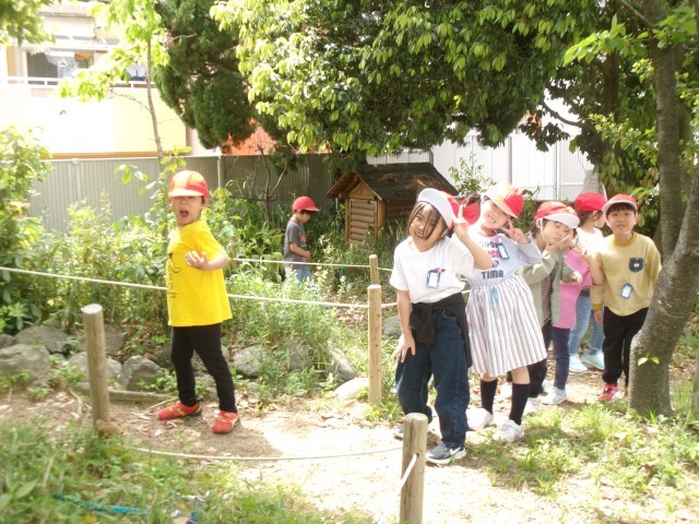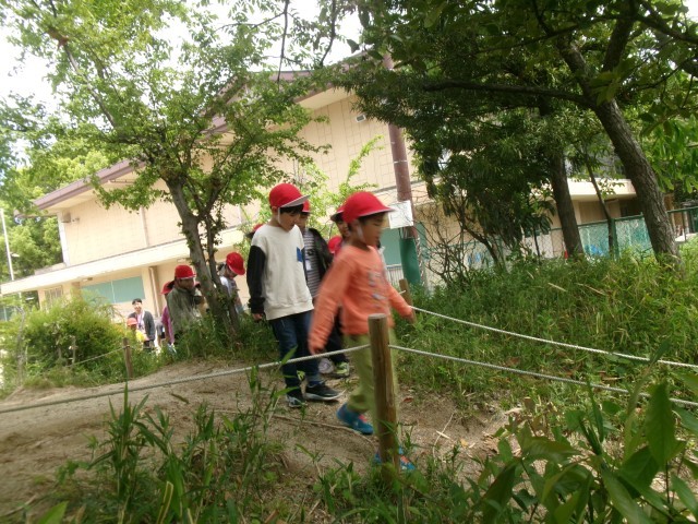 「もっと、学校のことを知りたい!」ということで、探検に行くことになりました。今日は、まず運動場です。果樹園やウサギ小屋、あかしやの森などを探検に行きました。レモンの木を見つけると、びっくりしていました。探検をしながら、入ってはいけないところや遊び方のルールなどを確かめました。みんなしっかりと聞いてくれていました。