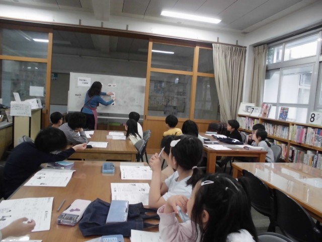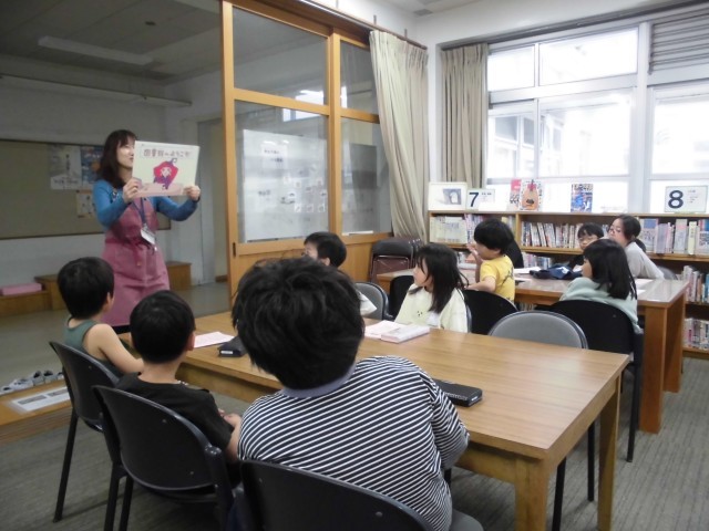 司書教諭による図書館の使い方についての紙芝居を聞きました。そして、本の仲間分けについても確認しました。