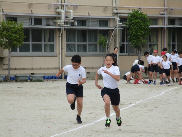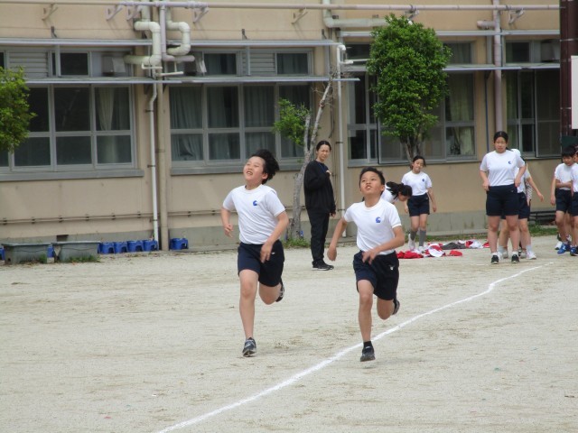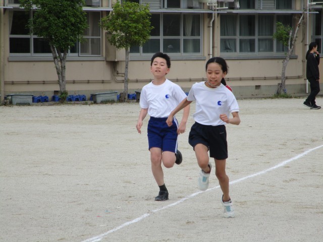 6年生になって初めての50m走を学年みんなで走りました。「がんばれー!」と大きな声で応援されて、みんな一生懸命に最後まで走り切りました。