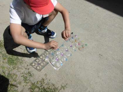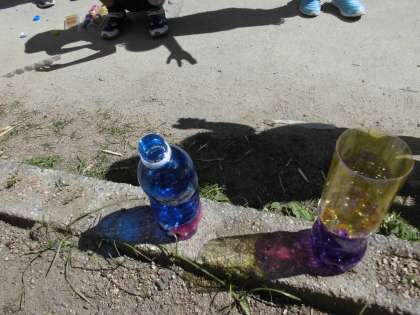 図画工作科で材料に光をあてて,形や色を作り出す学習をしました。ペンやセロハンで色をつけたペットボトルやたまごパックに光をあてて,きれいな色が地面にうつる様子を楽しむことができました。
