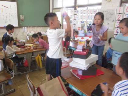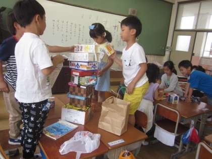 持ってきてもらったお菓子の箱など,形で仲間わけをしたり,積み上げてみたりして遊んでみました。