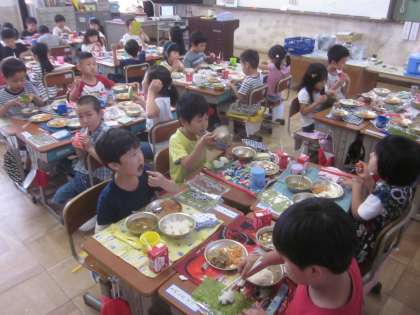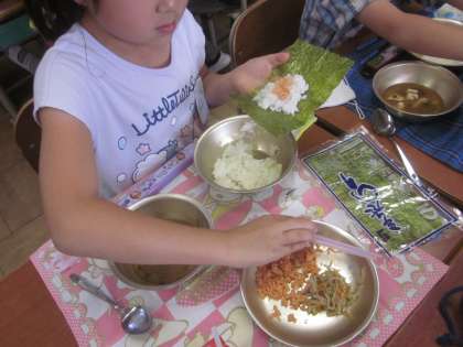 今日の給食は手巻きおにぎりでした。みんなとっても楽しそうに作っていました。