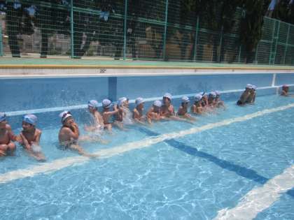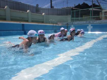 低水位(20cmほど)のプールでの水慣れ,ワニになって遊びました。