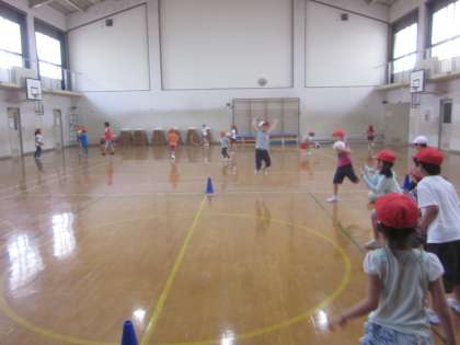 運動場改修工事の為,今日は体育館で遊びました。中当てやフラフープでとっても楽しそうでした。