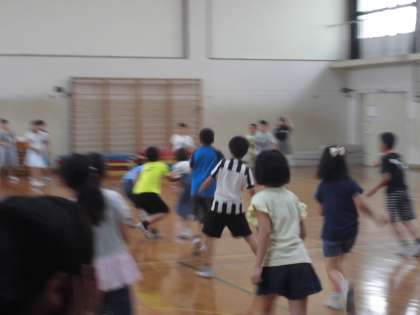運動場が使えない間,休み時間にクラスでみんな遊びを楽しんでいます。体育館が割り当てられているときは,『王さんとり』をしたり,『ドッジボール』をしたりして体育館狭しと動き回っていました。また,体育館の割り当てのない時は,教室で『フルーツバスケット』をしたり,『お笑い』をしたりして楽しい時間を過ごしています。ただ,高学年は,中間休みや昼休みに委員会活動があるので全員参加ができない時があり,残念です。委員会や係の仕事をできるだけ調整して,参加して楽しんでいます。