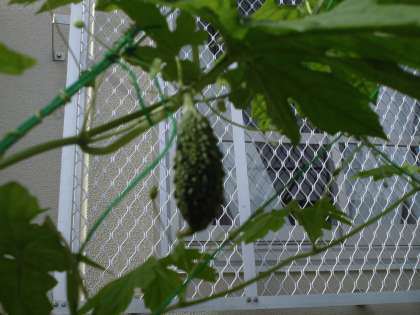 4年のツルレイシ(ゴーヤ)がすくすく成長中です。葉が増え,花が咲き,実がなってきました。先週末に小指ほどの大きさだった実が,親指ほどに!毎日の変化が楽しみです。