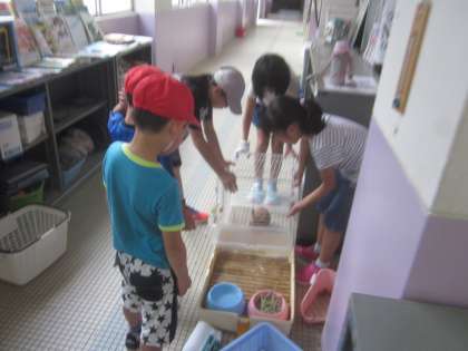 朝から飼育委員会の子どもたちがケージをきれいにしてくれています。その横では1年生が興味津々です。嬉しいピョン!