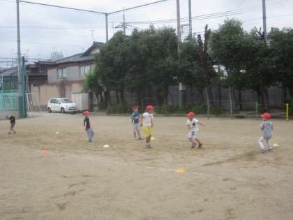 運動場では,自分たちで進めるドッジボール,楽しんでいます。砂場の近くでは葉っぱや枝をまぜまぜ…料理作りを楽しんでいました。