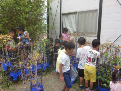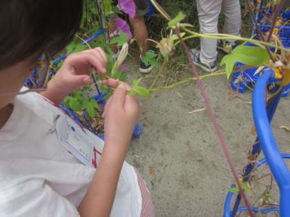 アサガオの観察をすると,種がいくつもついているのがありました。拾って観察,「種ってなんな〜ん?」「種って,赤ちゃんなんかな?」「子どもたちのつぶやきが広がりました。そんなやり取りがとっても楽しい時間でした。