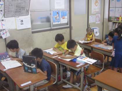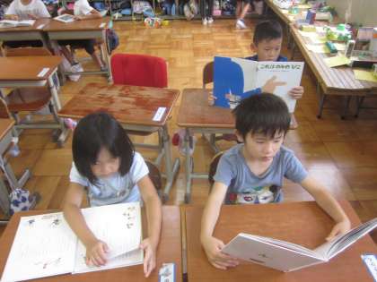 じっくりと本を読む子どもたちです。定期的に本棚の中を変えて,子どもたちの興味を幅広く広げていきたいと思います。