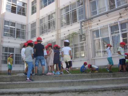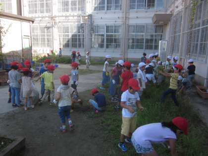 1時間目の全校行事「草引き」,1年生の子どもたちは花壇の周りをがんばりました。根っこについている土もトントンはたいて,上手に集めました。友だちと協力し合ってがんばりました。