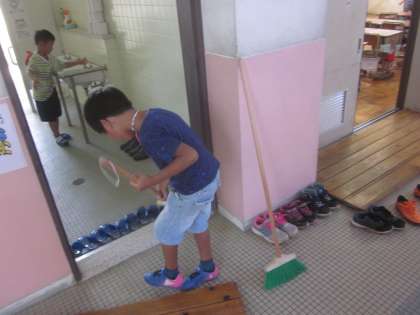 みんな一生懸命です!砂埃で汚れていた床がピカピカになりました。
