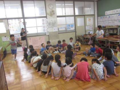 外は雨…教室でハンカチ落しを楽しみました!「自分のところに落してほしいな」とみんな一生懸命に願っていました。