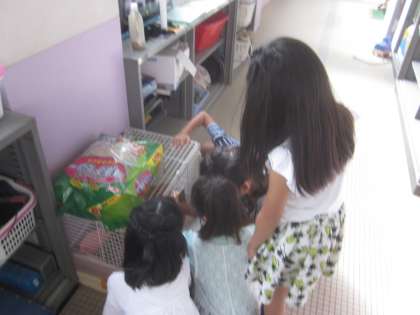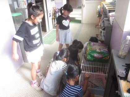 朝休みからいっぱい友だちが集まってくれています。みんなモモちゃんに声をかけたり,優しく触ったりして触れ合っています。