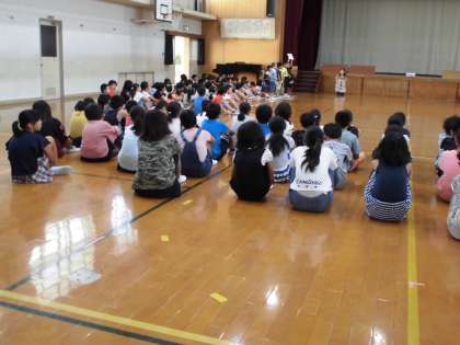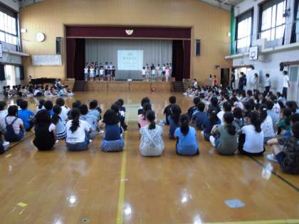 今日は,朱六タイムがありました。全校合唱で「ビリーブ」の練習をした後,1年生の詩の発表「ひとことじてん」,2年生の発表「だいすきいっぱい わたしのまち」を聞きました。1年生も2年生もとても上手な発表でしたが,聞いている5・6年生の姿勢もとても素敵で,さすがは高学年という感じでした。